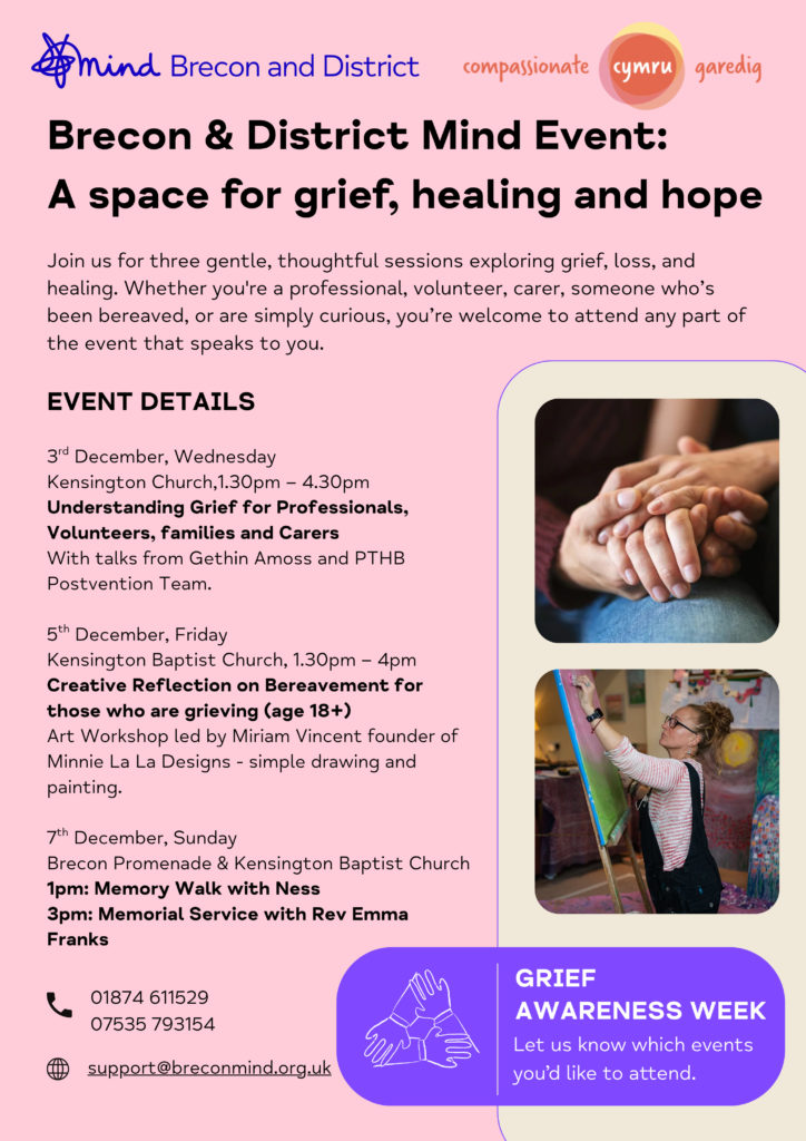 Brecon Mind are hosting a series of events over 3 days during National Grief Awareness week this December to which you are warmly invited.
